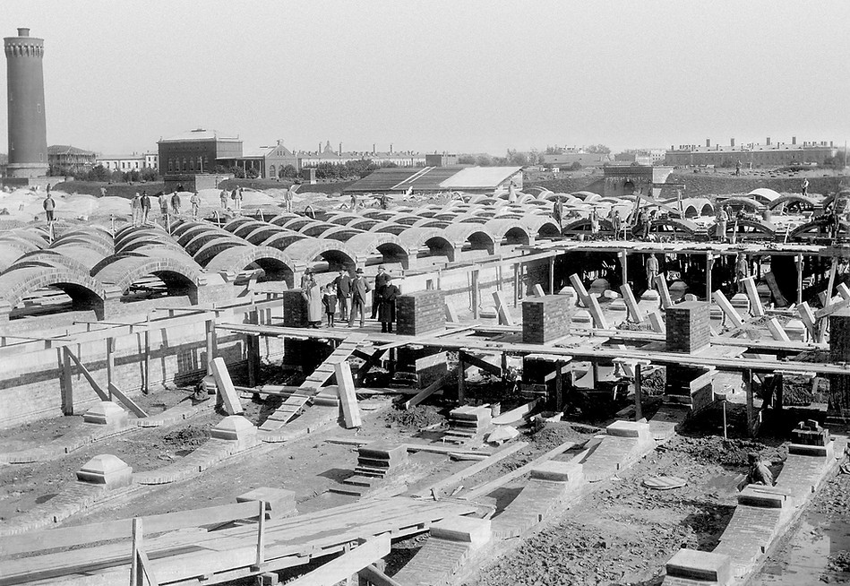 Budowa zbiorników wody w Łodzi. 1935-1937 r. (projekt Williama H. Lindleya. Zostały zbudowane na planie czterech kwadratów o boku 60 m każdy, ze specjalnie wypalonej cegły, ze ścianami w kształcie łuków, by zmniejszyć ciśnienie zgromadzonej w nich wody. (arch. ZWiK Łódź)