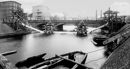 Budowa rurociągu z Zakładu Uzdatniania Wody "Na Grobli" we Wrocławiu przez rzekę Oławę - 1937 r. (arch. MPWiK Wrocław)